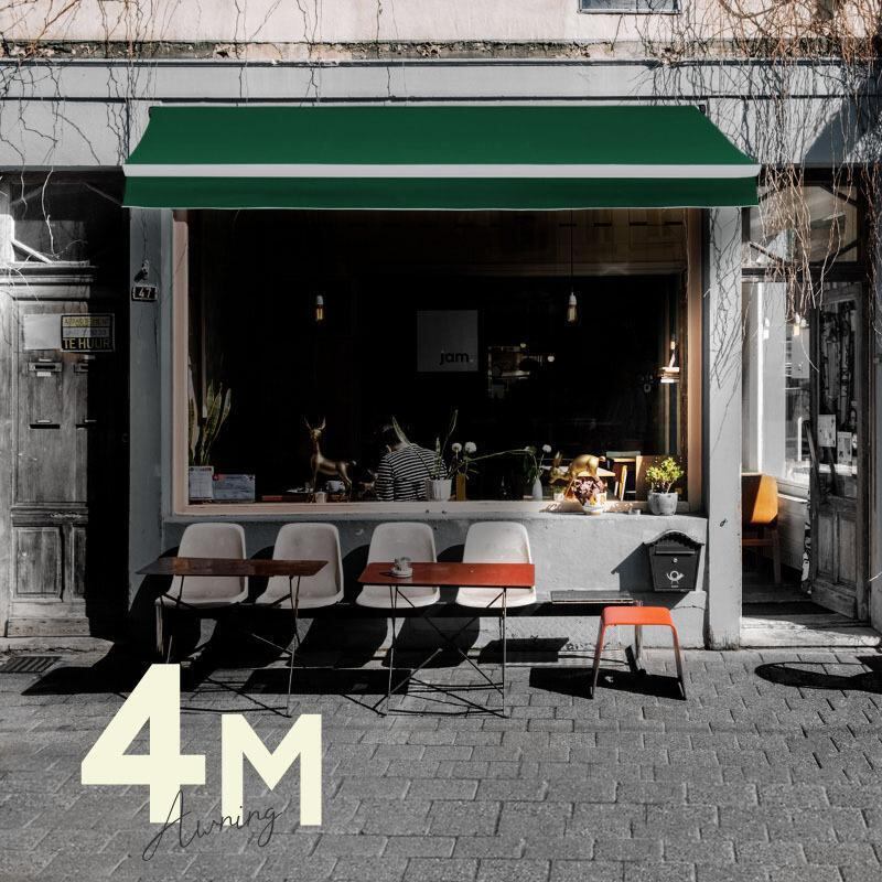 オーニングテント 4M 張出 2.5m 巻き取り式 防水 格納式 手動 白フレーム グリーン 緑 日よけ サンシェード
