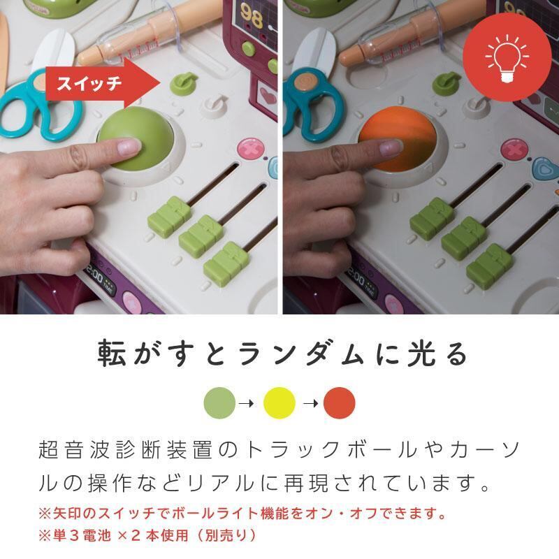 ・体温計、聴診器、その他光るアイテムは、ボタン電池を各2個使用します。