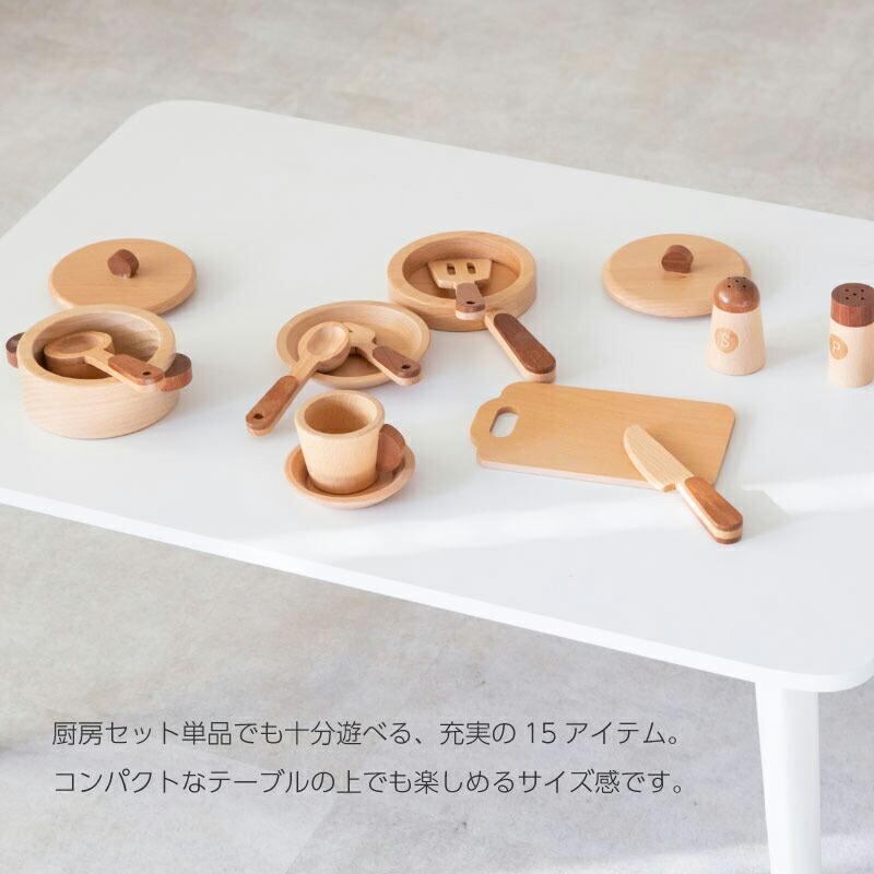 自然素材のキッチンツールで、木のぬくもりを感じながら安心して遊べます。