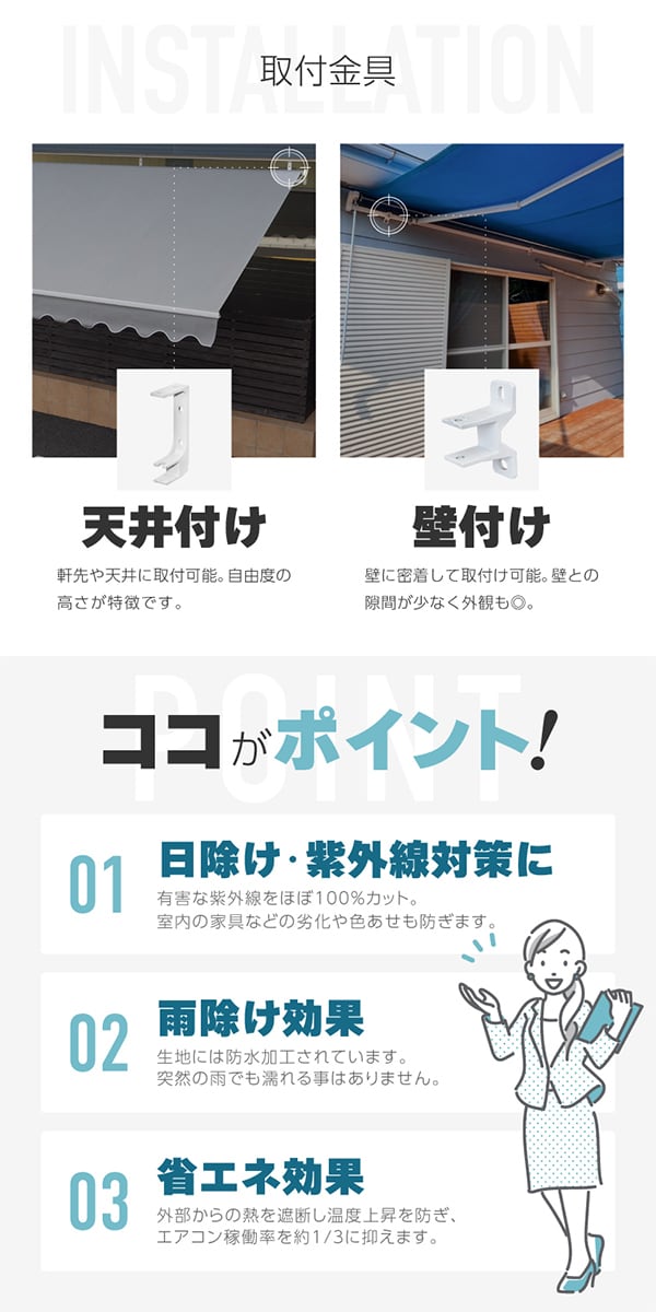 【フルオーダー】オーニングテント 生地81色から選べる 【3m 生地本体セット】 UV99%カット 防水 省エネ 日よけテント サンシェード 雨よけ 壁付け 天井付け テラス ベランダ 玄関